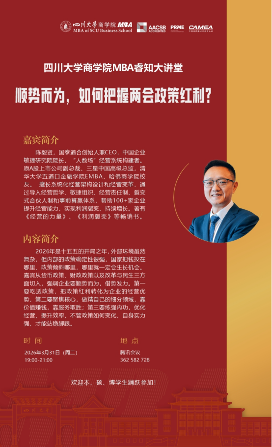 四川大学130周年校庆系列活动 | 四川大学商学院MBA睿知大讲堂——顺势而为,如何把握两会政策红利?