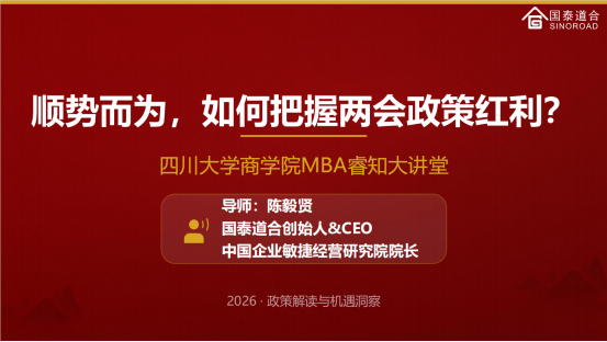 3月31日晚,国泰道合创始人兼CEO、中国企业敏捷研究院院长陈毅贤受邀做客四川大学商学院MBA睿知大讲堂,在云端为MBA同学带来“顺势而为,如何把握两会政策红利”的专题讲座。