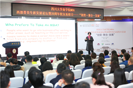 2018年11月24日,四川大学商学院MBA“西部菁英生涯发展论坛暨20周年校友返校日”活动在四川大学商学院205会议室隆重举行。本次论坛以“创变•聚合•发展”为主题,围绕变革与机遇、再定位与发展,邀请到国内知名学者、职业规划方面的企业专家以及优秀校友,通过主题演讲和圆桌讨论的形式,从生涯规划、发展优势、职业定位等方面切入,与现场近300名MBA校友、在校生,行业菁英一起交流观点、分享经验、为生涯发展提供了新思路。